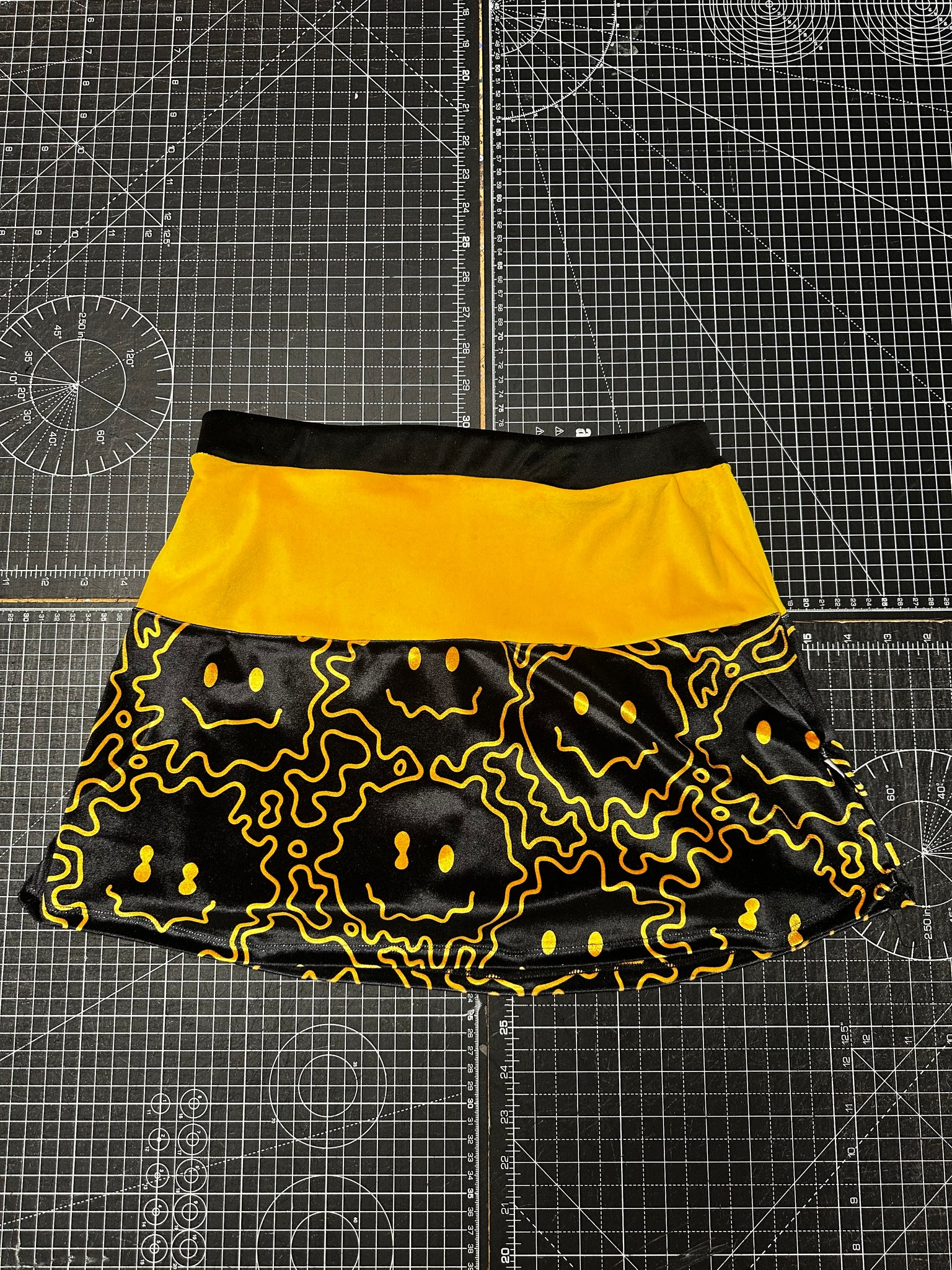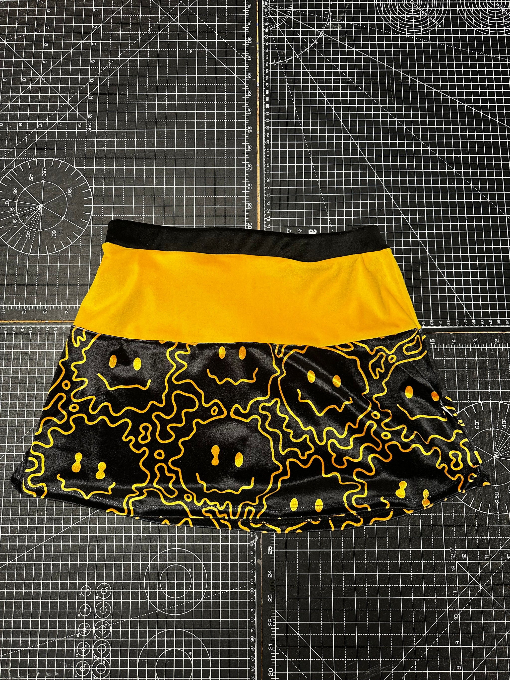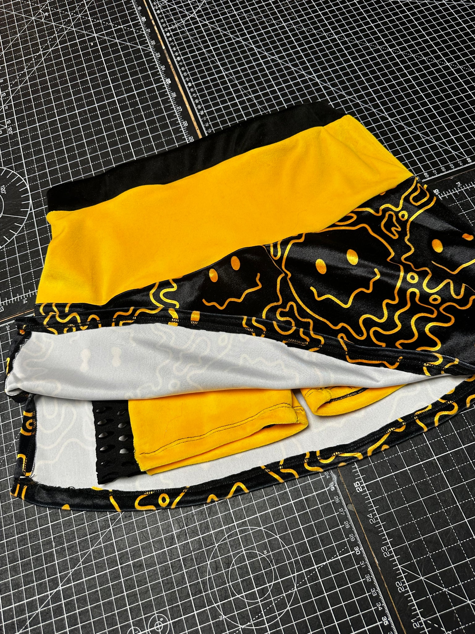 • Made with: rave-style yellow smiley velvet paired with yellow velour